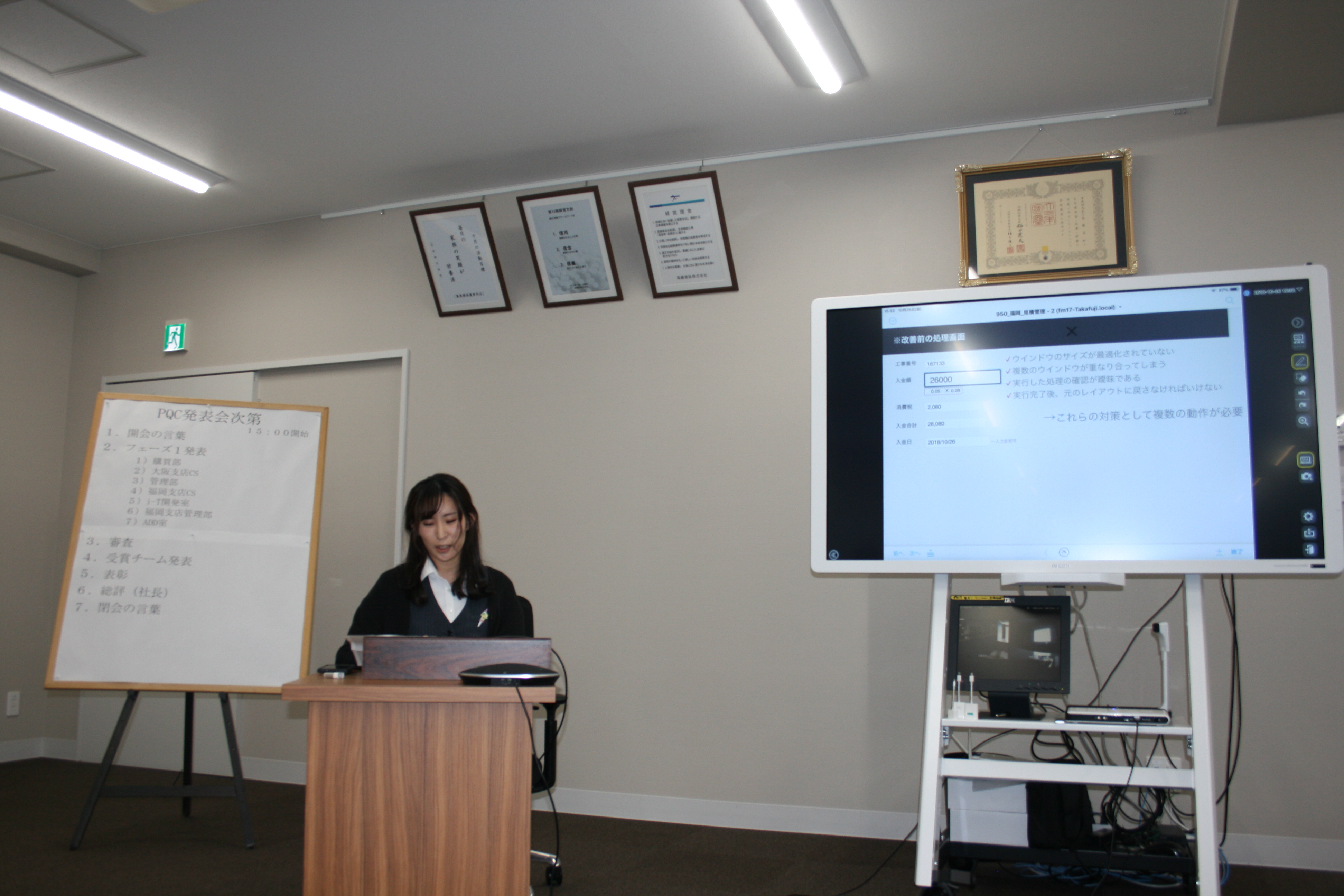 社内でPQC発表大会を開催しました news 2018.11.02社内の各部門で、日常業務の様々な工夫、改善を独自のPQC活動として実施しております。今回7つの部署がその内容を発表しました。その結果、福岡支店の管理部が優秀賞に選ばれました。